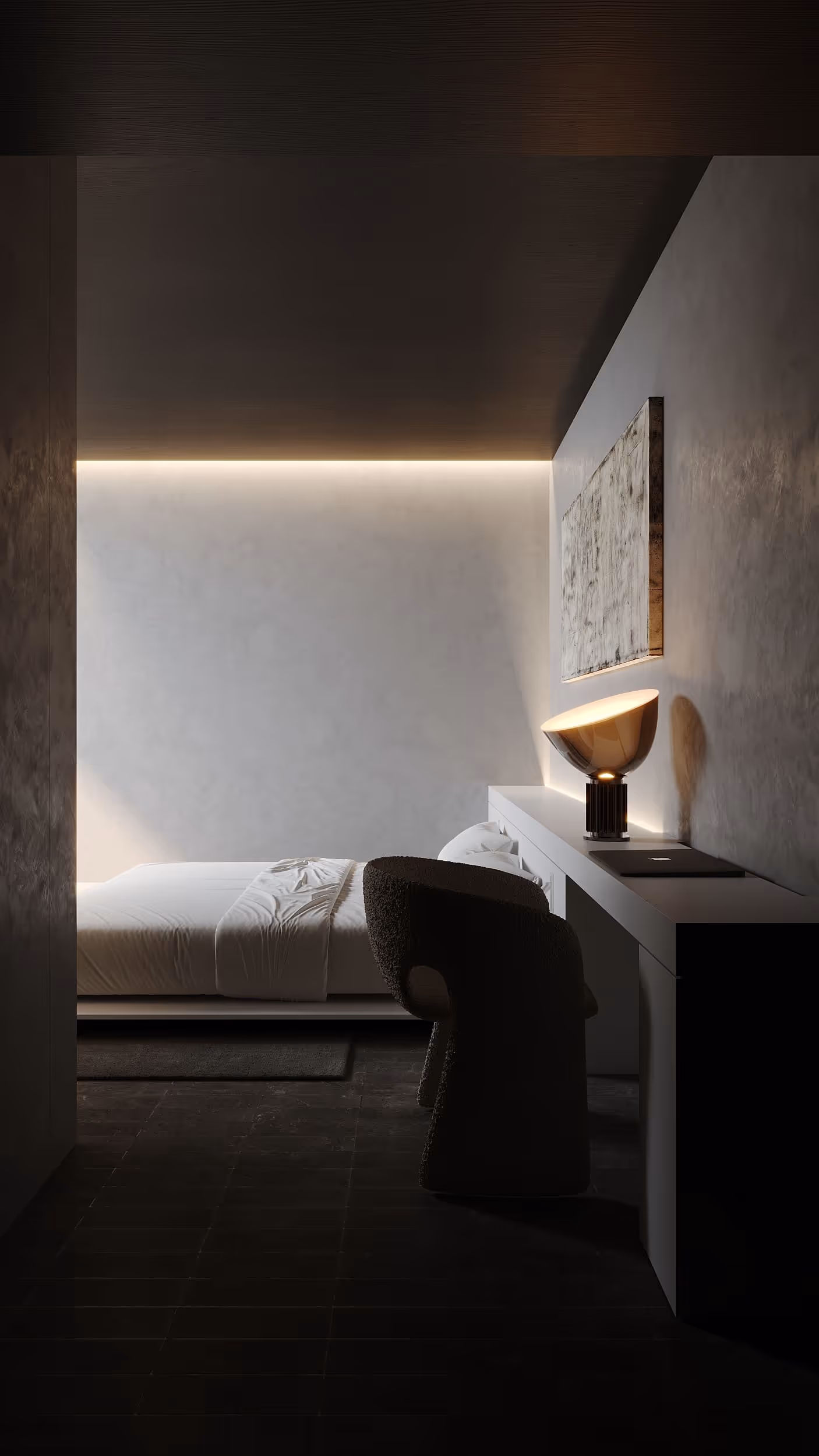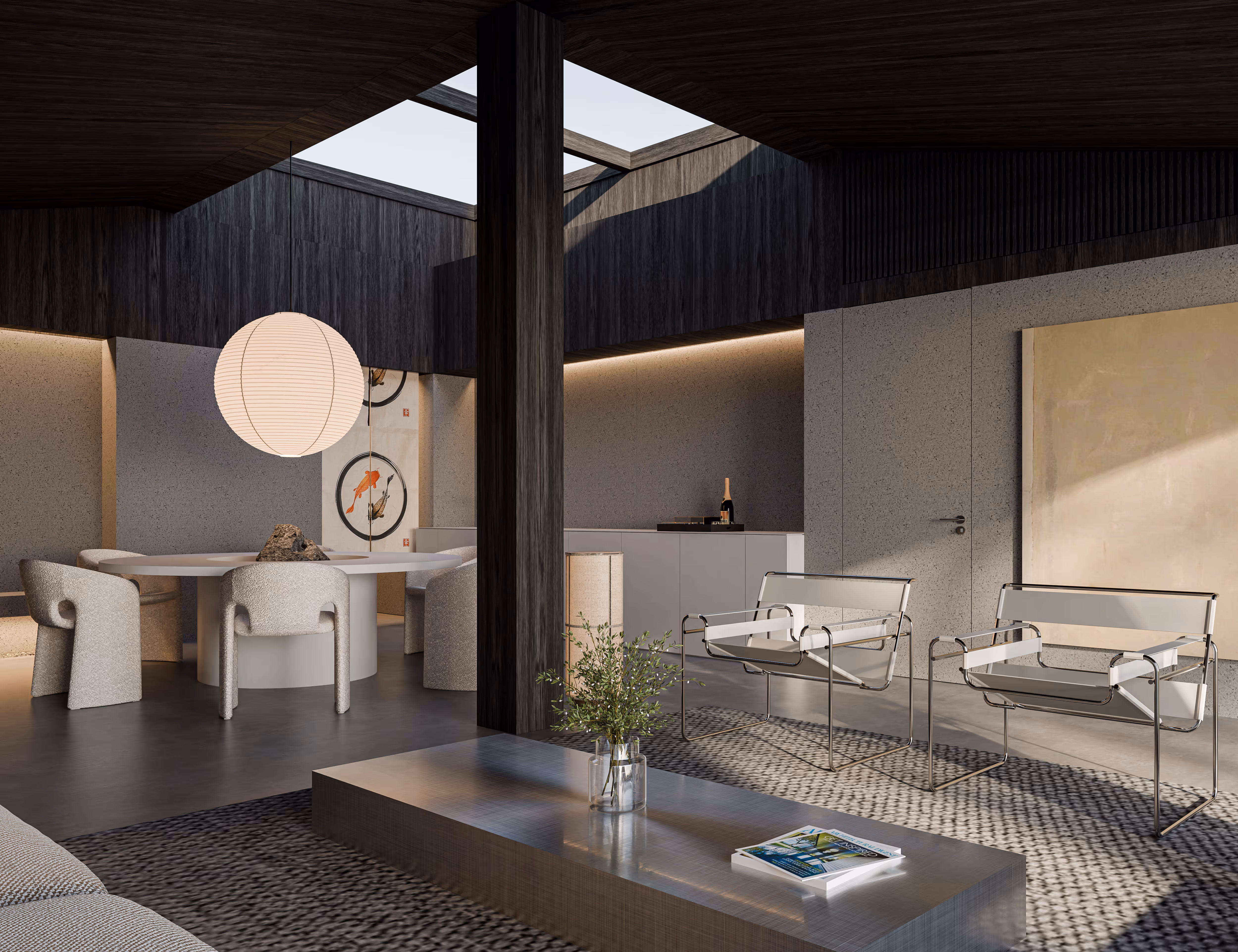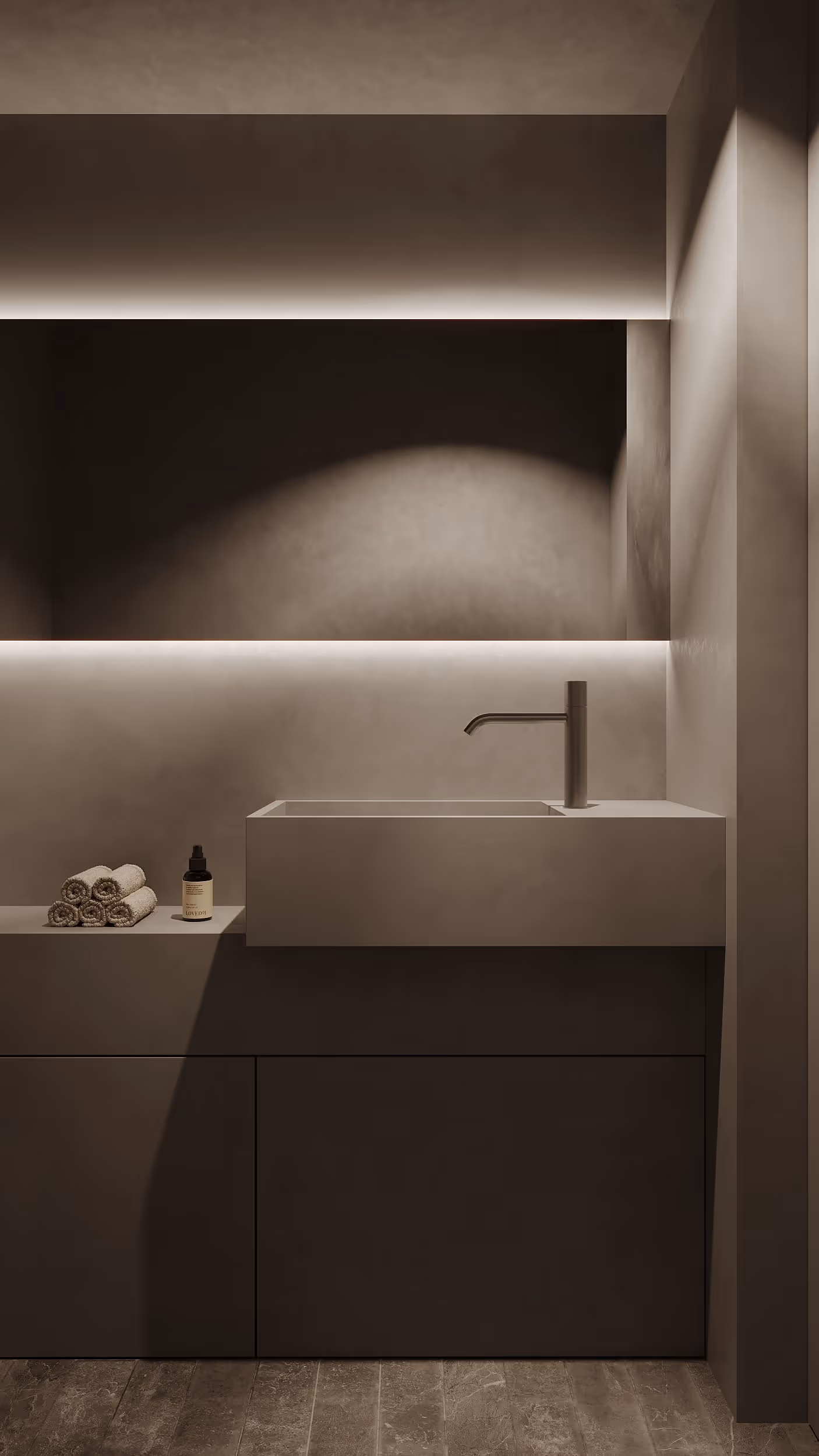 The smell of wood, linen and stone after rain. The space breathes naturally — without artificial fragrances.