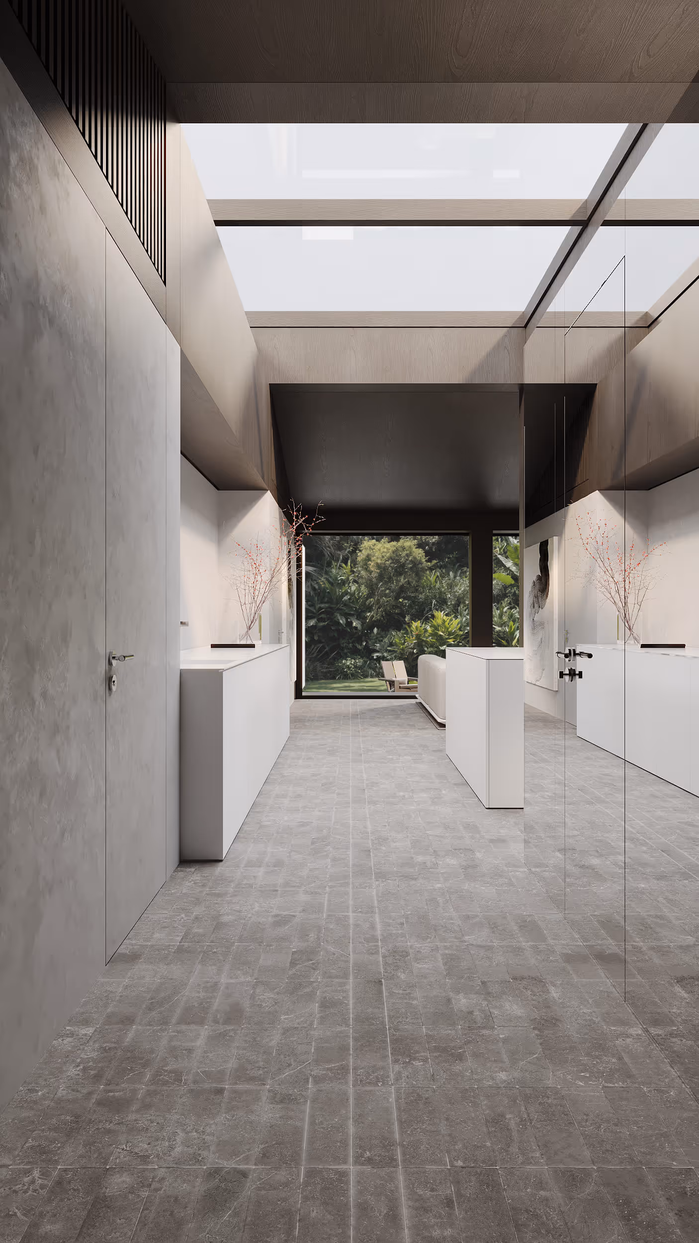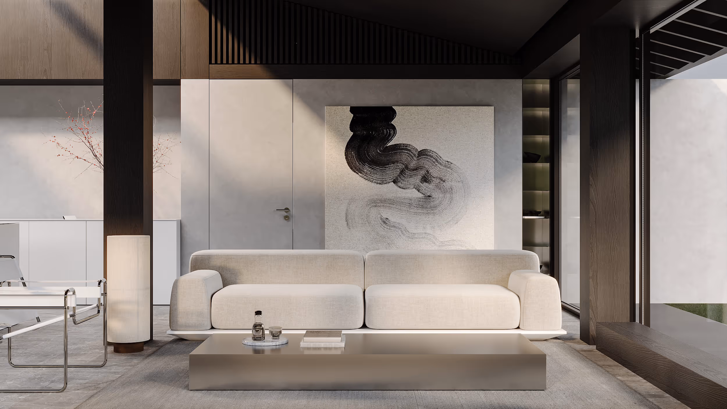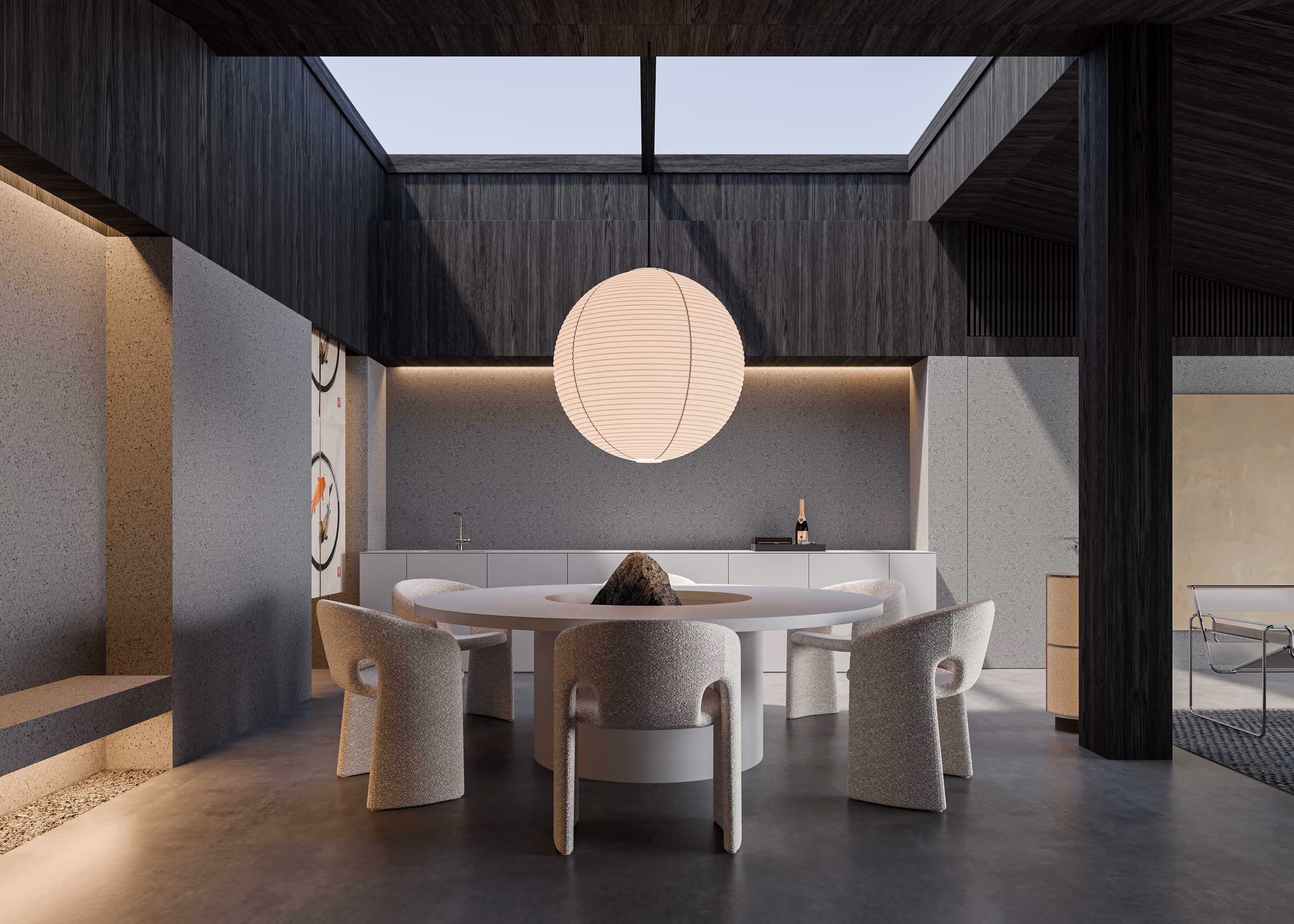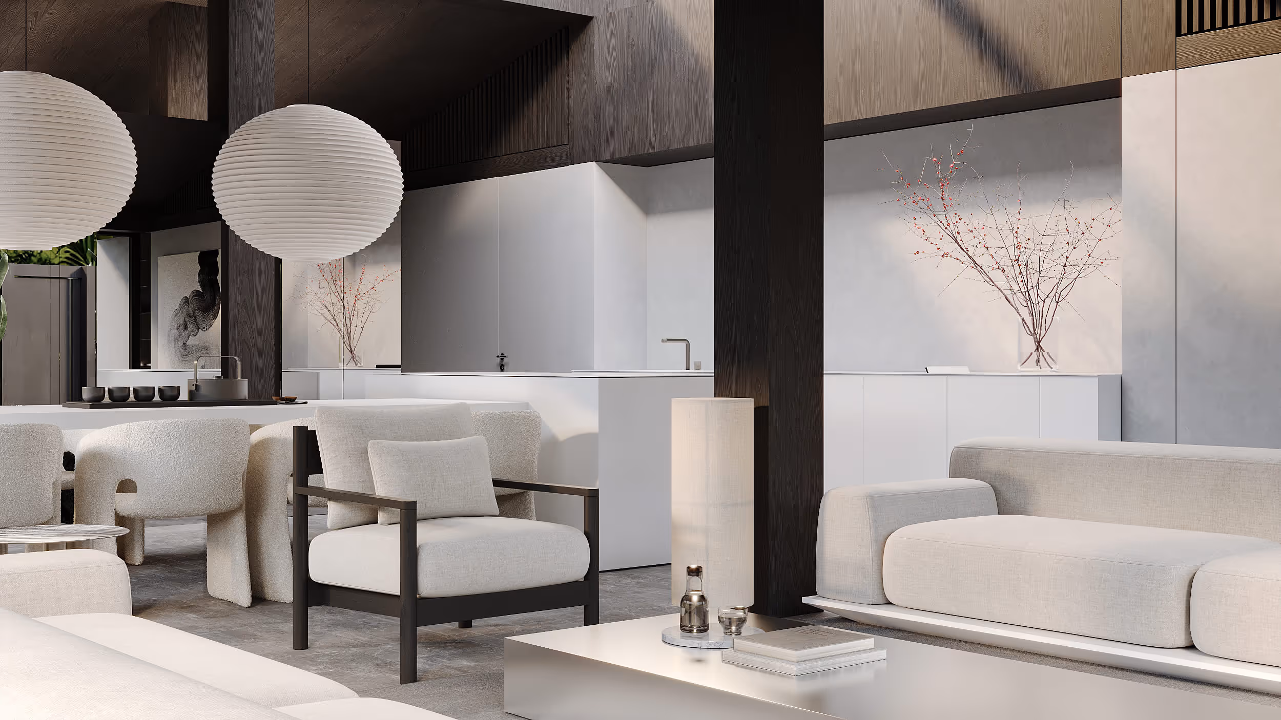 The smell of wood, linen and stone after rain. The space breathes naturally — without artificial fragrances.
