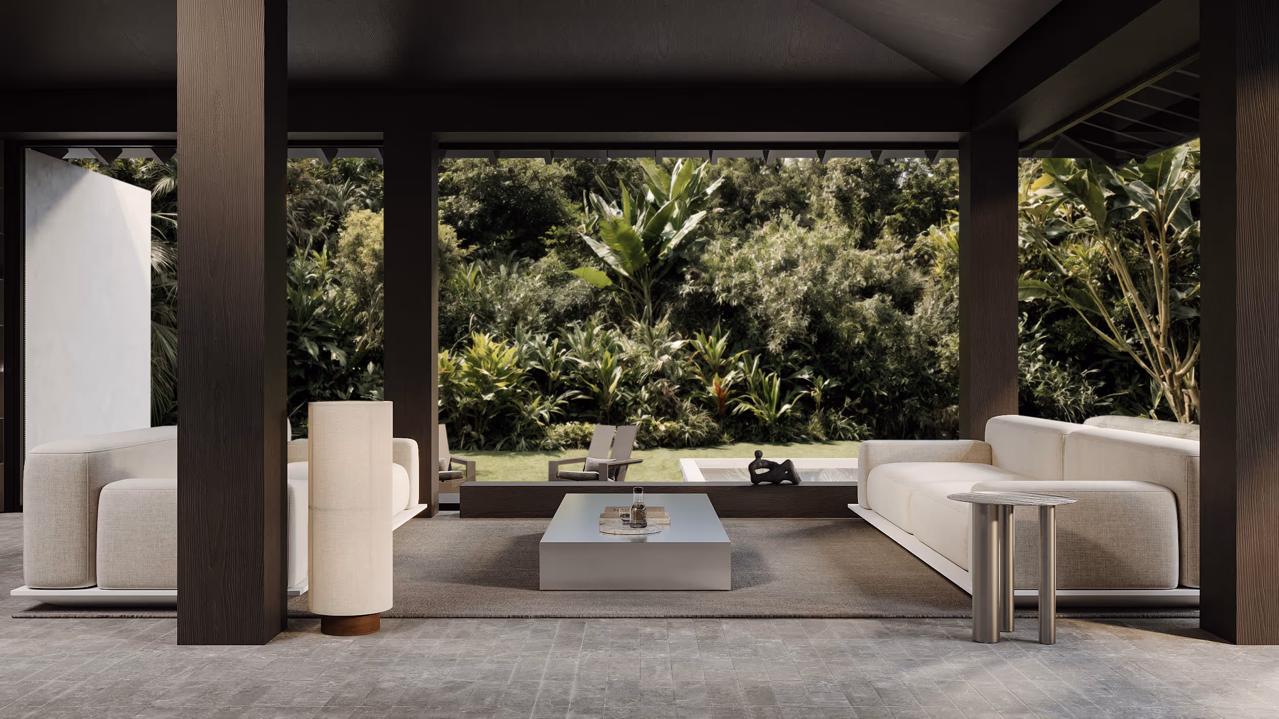 Soft acoustics thanks to natural materials. No echoes — just the rustle of palm trees, the murmur of water and the wind in the leaves.